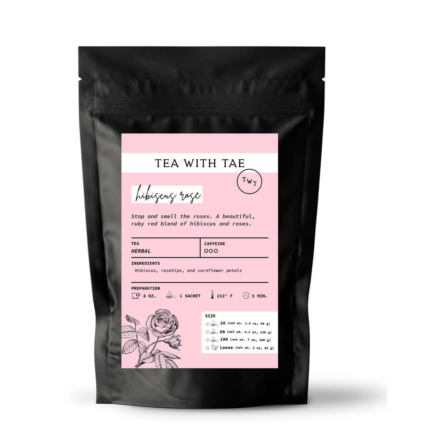 HIBISCUS ROSE (CAFFEINE-FREE): Take a moment to appreciate life’s simple pleasures. This rich herbal tea blend combines hibiscus, rosehips, and cornflower petals to create a harmonious and nuanced flavor. The blend’s balanced intensity makes it an excellent choice for enjoyment throughout the day.